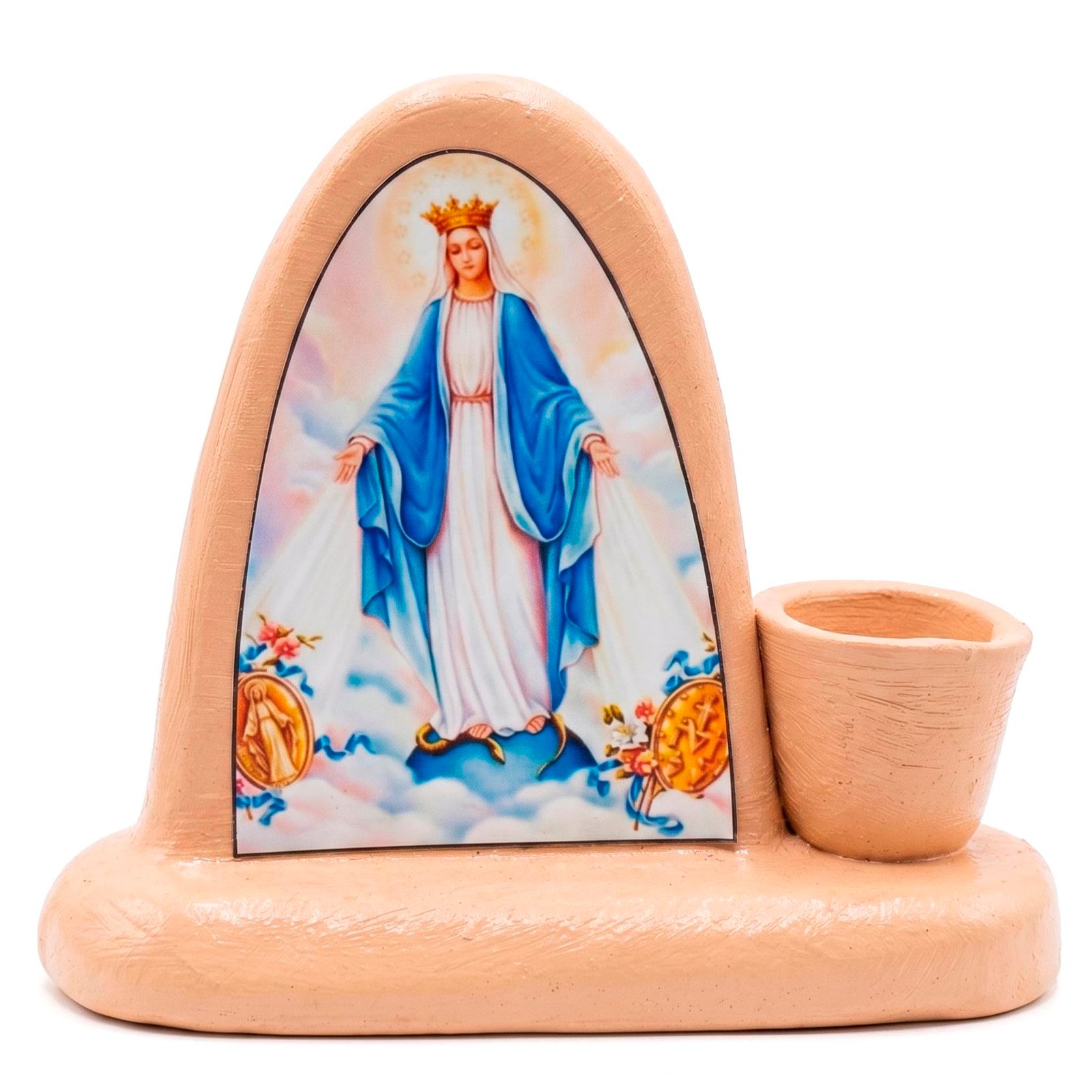 Diseñado para honrar su promesa de protección y bendiciones abundantes, incluye un soporte para vela que simboliza la luz de la fe y la esperanza que María derrama sobre sus hijos. Un espacio sagrado para depositar tus intenciones y recordar diariamente que sus manos están siempre abiertas para otorgar gracias a quienes las piden.