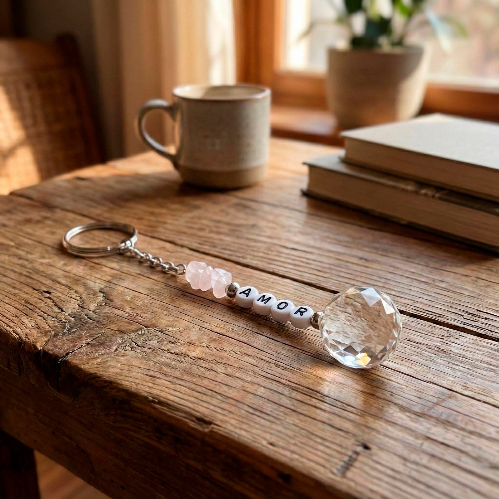 Llavero artesanal con cuarzo rosa auténtico, la gema del corazón.